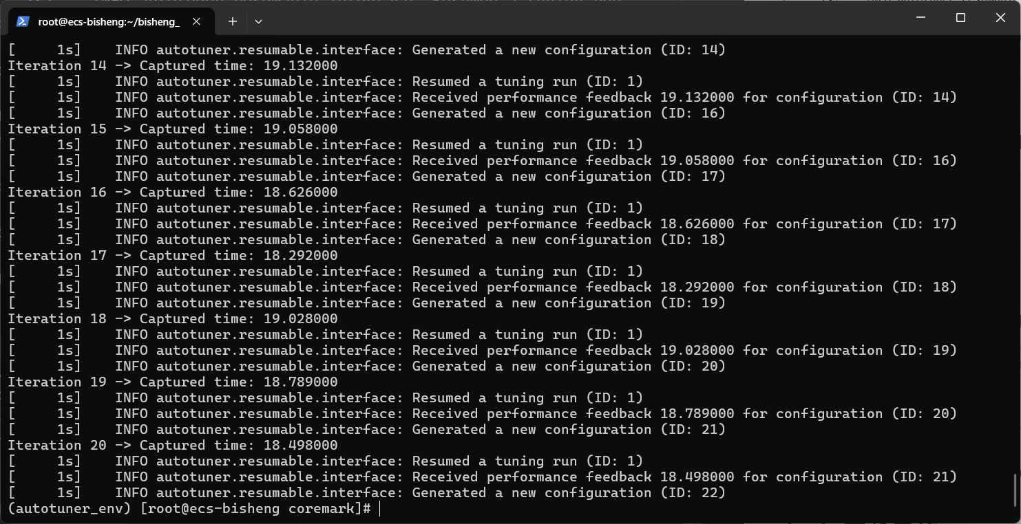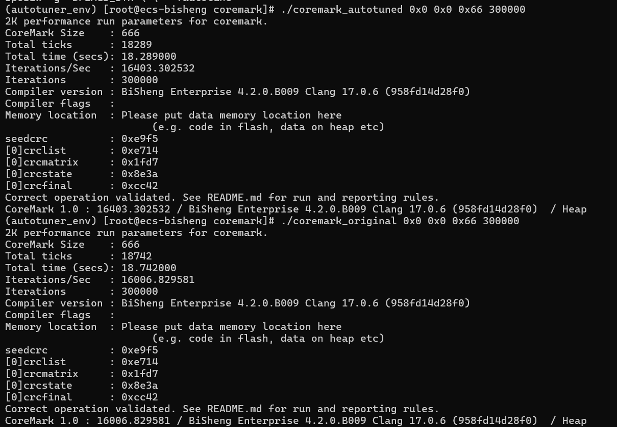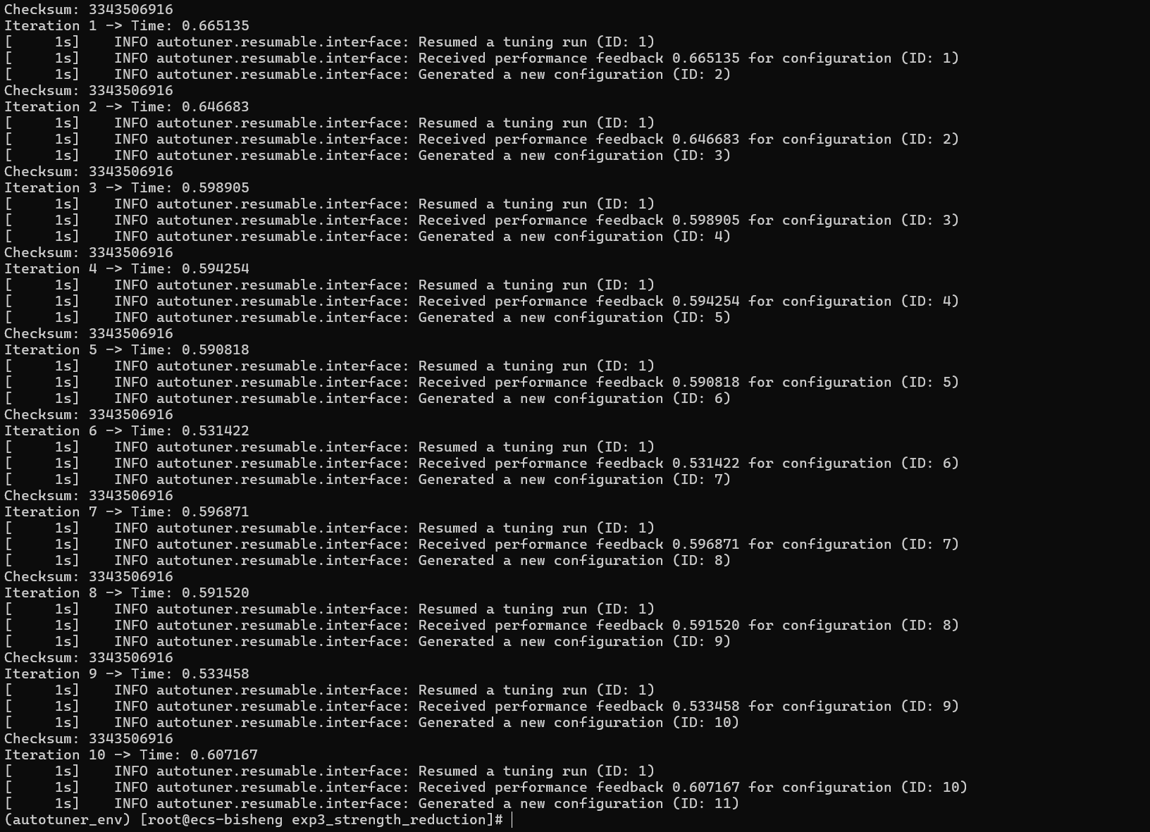 在强大的-O2优化基础上,Autotuner 再次将性能提升了约 14.5%(0.047 / 0.041 ≈ 1.146)。这证明,对于这个计算和访存都足够复杂的场景,编译器的默认-O2启发式策略虽然已经很优秀,但仍未达到最优。Autotuner 通过10次迭代搜索,成功找到了一个更极致的参数组合(可能涉及更优的循环展开因子、指令预取距离或向量化策略),从而压榨出了最后的性能潜力。