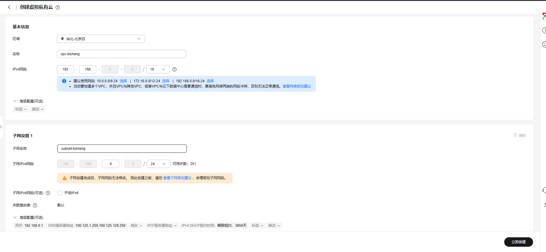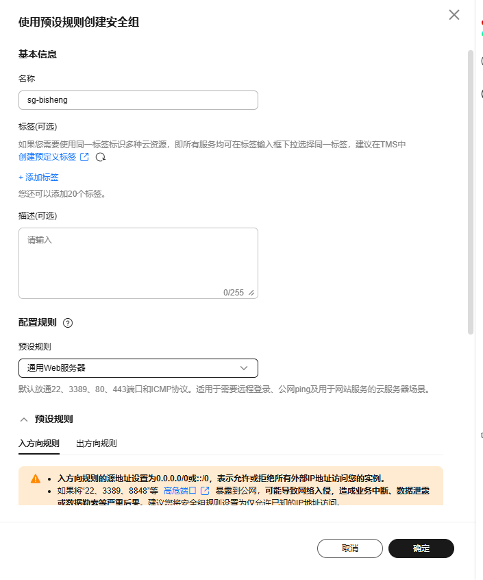 配置项 配置值 计费模式 按需计费 区域/可用区 华北-北京四 | 可用区1 实例规格 鲲鹏通用计算增强型 | kc1.xlarge.4 | 4vCPUs | 16GiB 操作系统镜像 openEuler-22.03-LTS-SP3 (aarch64)(V22.03) 系统盘 通用型SSD, 50GiB 虚拟私有云 vpc-bisheng(192.168.0.0/16) 主网卡 subnet-bisheng(192.168.0.0/24) 源/目的检查 开启 安全组 sg-bisheng(通用web服务器) 弹性公网IP 全动态BGP | 按流量计费 | 5 Mbit/s 云服务器名称 ecs-bisheng 登录凭证 密码 购买数量 1