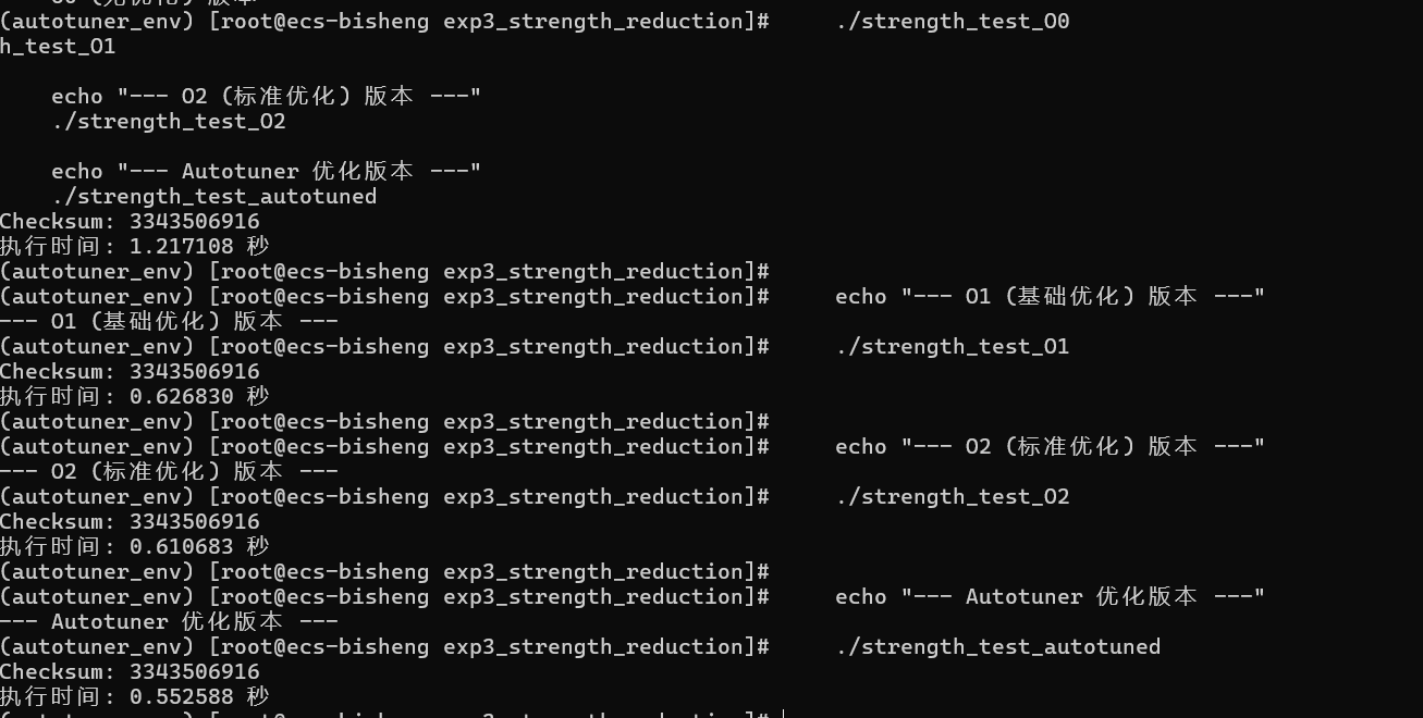 echo "--- O0 (无优化) 版本 ---" ./strength_test_O0 echo "--- O1 (基础优化) 版本 ---" ./strength_test_O1 echo "--- O2 (标准优化) 版本 ---" ./strength_test_O2 echo "--- Autotuner 优化版本 ---" ./strength_test_autotuned