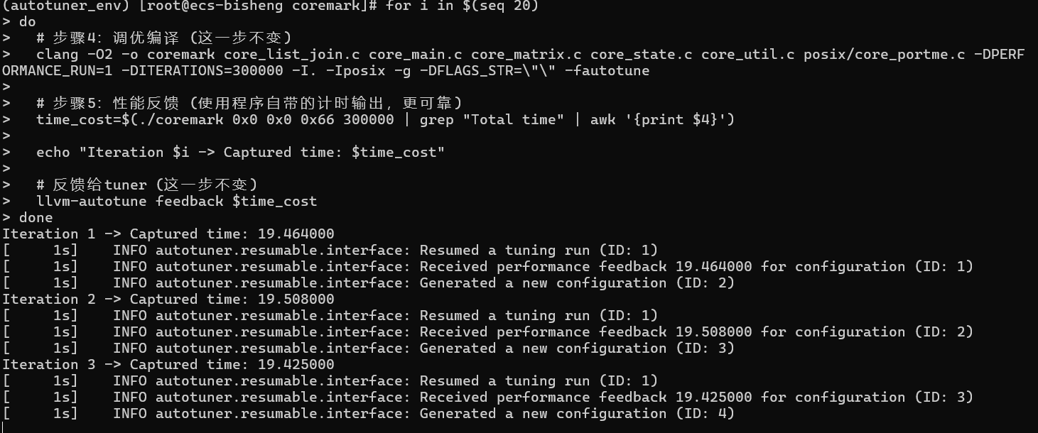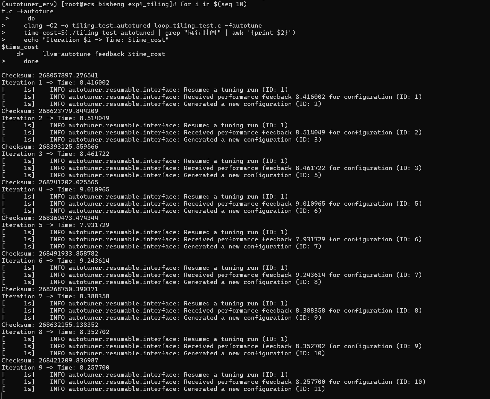 # 1. 配置环境并分析代码 export AUTOTUNE_DATADIR=~/autotuner_tiling_data/ rm -rf $AUTOTUNE_DATADIR && mkdir -p $AUTOTUNE_DATADIR clang -O2 -o tiling_test_autotuned loop_tiling_test.c -fautotune-generate # 2. 初始化 llvm-autotune minimize # 3. 迭代 (矩阵乘法计算量大,10次迭代可以看到效果) for i in $(seq 10) do clang -O2 -o tiling_test_autotuned loop_tiling_test.c -fautotune time_cost=$(./tiling_test_autotuned | grep "执行时间" | awk '{print $2}') echo "Iteration $i -> Time: $time_cost" llvm-autotune feedback $time_cost done# 4. 结束并生成最终版 llvm-autotune finalize clang -O2 -o tiling_test_autotuned loop_tiling_test.c -fautotune -