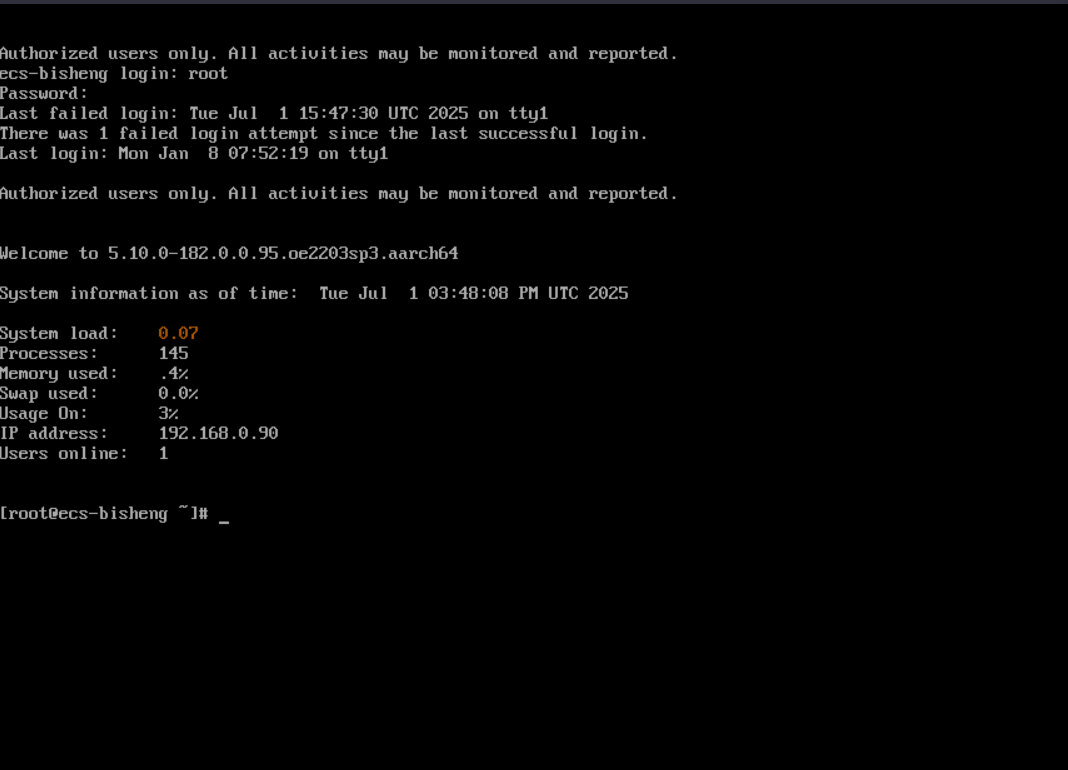 - 随后可以在这个页面通过密码登录(输入root,回车,然后输入密码,注意输入密码时你看不到输入):