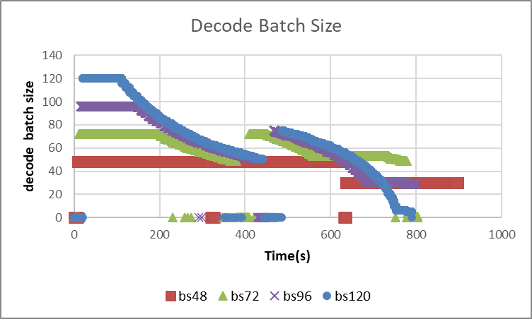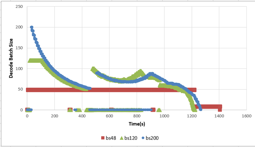 可以发现随着并发的增加,端到端的时延在逐步变好,通过维测指标我们画出了decode batch size随时间变化的图: