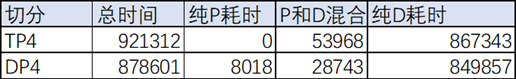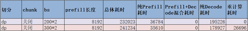 为了看清楚DP4和TP4在VLLM上的性能差异,我们将推理分为三种状态,分开统计耗时:纯prefill、chunked prefill、纯decoder,通过对forward耗时维测打点后我们统计了下性能数据(单位ms):
