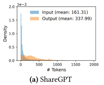 Sharegpt数据集的输入输出长度分布如下图所示,主流的典型长度都小于500(tokens)。