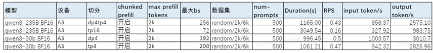 Qwen3-30B开启DP后性能与Qwen3-235B相比收益较小。以2k输入、6k输出场景为例,按照预留的kv cache计算可配置的最大bs,性能如下表所示: