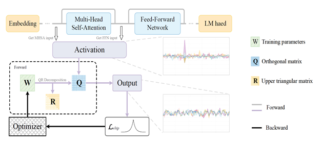 基于分布变换的旋转矩阵量化算法 (DartQuant) 如下图所示,基于激活正交旋转变换降低异常值水平,且通过低成本的离线训练校准方法获得正交变换矩阵: