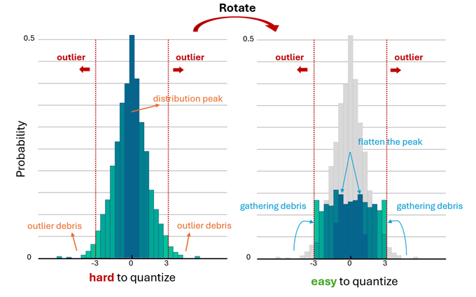 旋转矩阵变换是降低激活异常值分布水平的有效方法,旋转变换之后激活数据的主分布基本不变(如均匀分布或高斯分布)、而outlier分布水平显著降低,因此可使数据分布平坦化(或近高斯分布),有助于大幅降低W4A4量化误差: