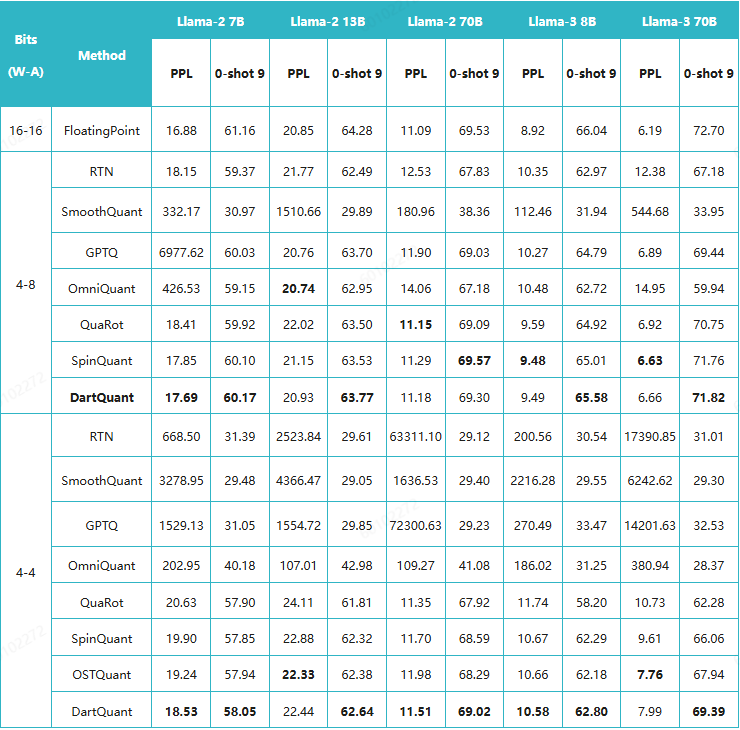 - 额外在Llama2-7B、Llama2-13B、Llama-3 70B、Mixtral-7×8B等模型上增加W4A8、W4A4等的摸高测试,增加5+测试集,优于Quarot、SpinQuant、OSTQuant等业界SOTA算法,证明了量化算法的泛化性;