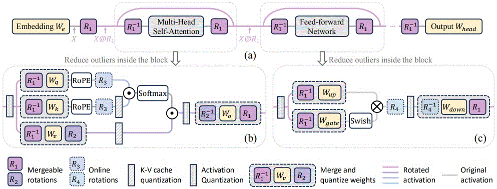 - 正交旋转量化:基于正交矩阵R,对线性层输入激活进行旋转量化;R的作用位置包括R1、R2矩阵等。