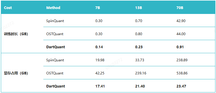 - 大幅降低离线训练校准的成本,单卡小时级完成旋转矩阵校准(Llama2-7B 单卡45分钟完成校准),并且显存成本降低2x~20x。