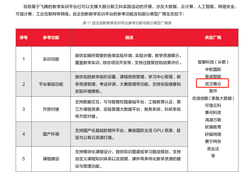 2024年,《教育行业数字化自主创新 飞腾生态解决方案白皮书》发布,唯众作为编委单位之一,自主创新基于飞腾的嵌入式/物联网、教学实训平台等教育产品,已涉及物联网、大数据、云计算、人工智能、网络安全、可信计算、工业互联网等领域。