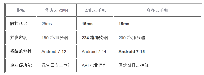 性能突破:联合华为云搭载RX7云手机服务器,实现2K 60FPS画质,端到端延迟低至60ms,单服务器支持224路并发。技术趋势:延迟优化(≤15ms)、国产化系统(CTyunOS)、安卓15适配成为竞争焦点。垂直领域强者:川川云(防封技术)、百度云(政企方案)、红手指(全平台兼容)专注细分市场;头部综合服务商:华为云、雷电云、多多云以性能与生态构建壁垒,覆盖游戏/办公全场景;场景覆盖:
