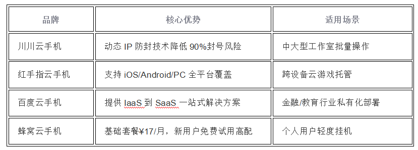 垂直领域强者:川川云(防封技术)、百度云(政企方案)、红手指(全平台兼容)专注细分市场;