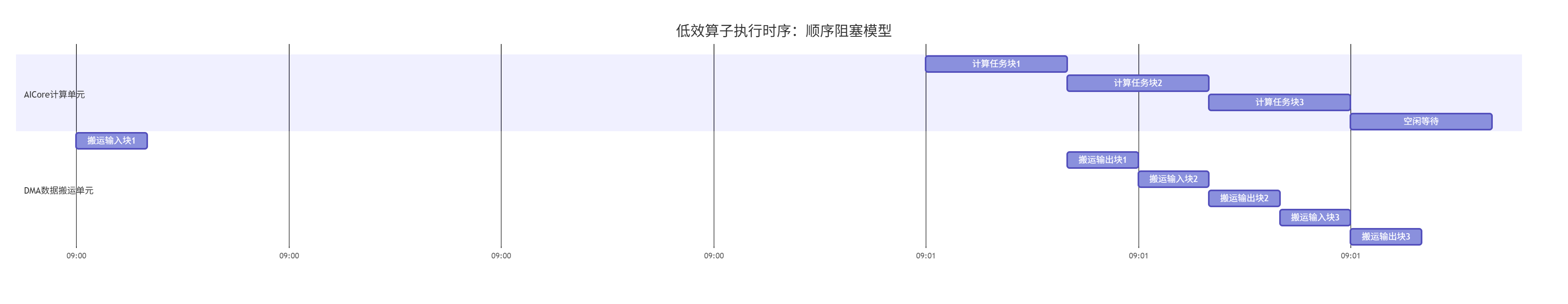 (图:顺序阻塞模型下,计算与搬运单元存在大量空闲时间,硬件利用率极低)