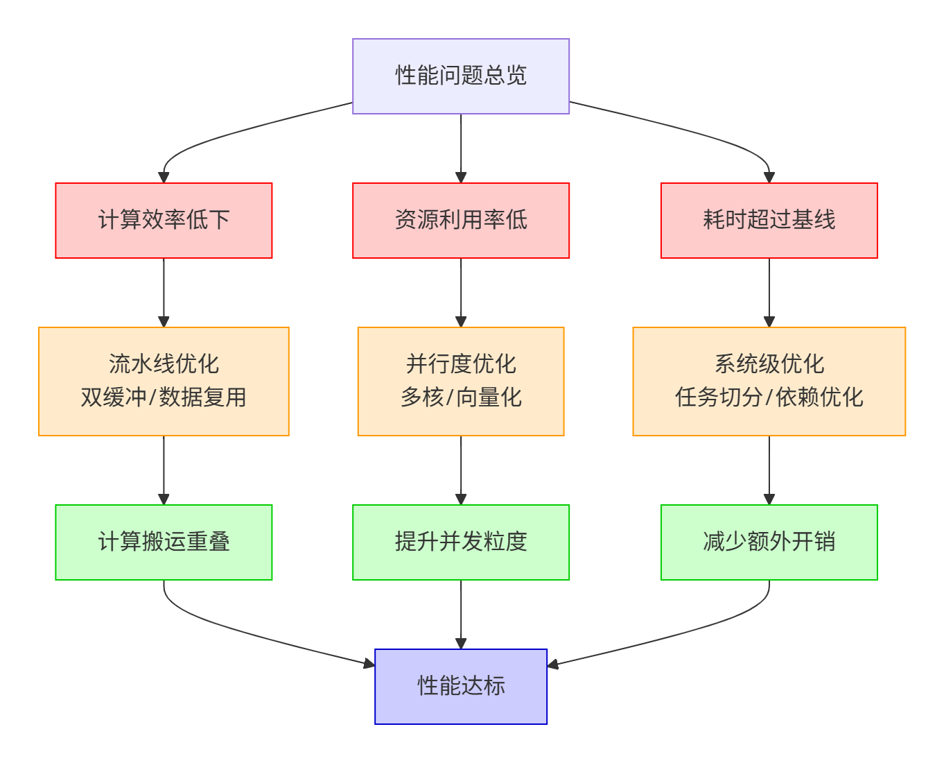 💡 来自CANN训练营教材的深度洞察: 素材中明确将 “计算流程实现未充分发挥硬件计算效率”与 “多核并行度不够”、“UB(Unified Buffer)使用不合理”并列为导致性能不达标的三大核心症结。这并非孤立的编码问题,而是反映了开发者对 Ascend NPU 这一大规模并行计算架构 (Massively Parallel Computing Architecture)的理解深度不足。许多开发者习惯于CPU的编程思维,未能将计算任务有效地映射到NPU的数据流驱动 (Dataflow-Driven)和存储层次化 (Memory Hierarchy)的执行模型上,最终导致强大的AICore计算单元因“饥饿”而闲置,或陷入低效的等待状态。