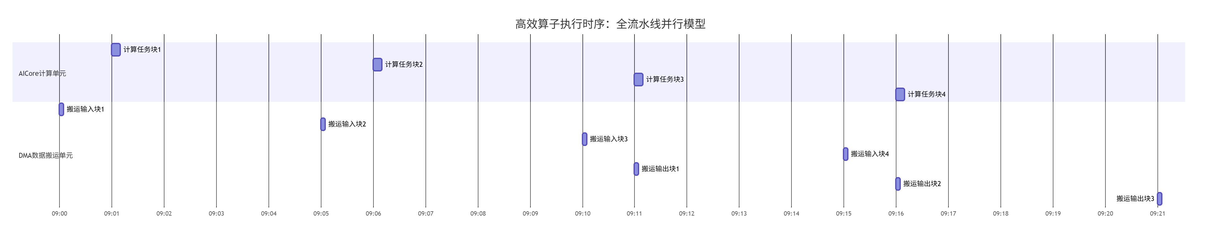 (图:理想的全流水线并行,计算与搬运完全重叠,硬件资源被持续喂饱,利用率接近100%)