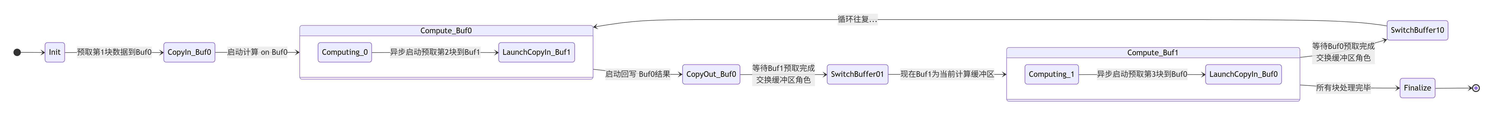 (图:双缓冲技术的精细状态机,展示了计算、搬运、同步和缓冲区角色切换的完整周期)