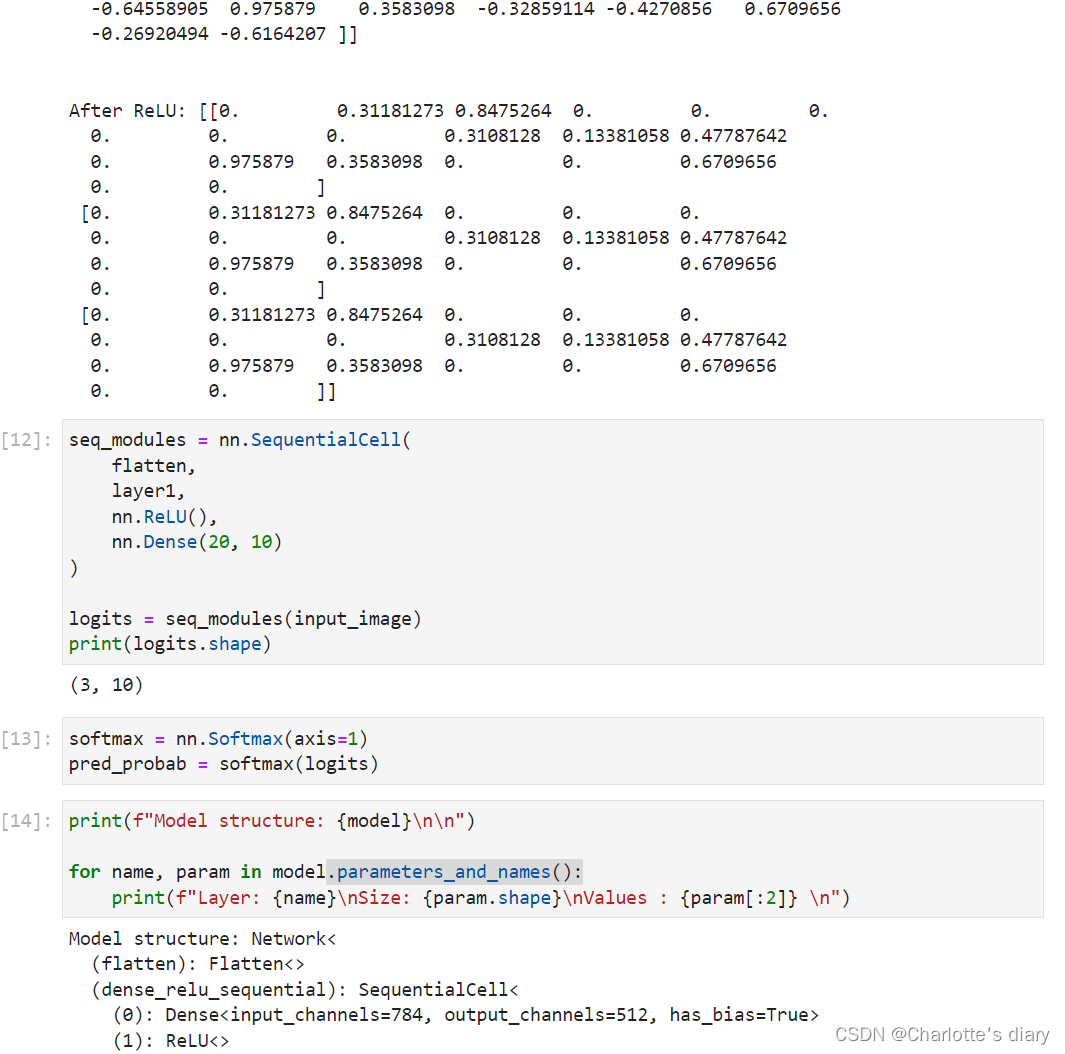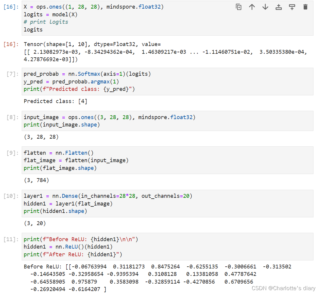 1. pred_probab = nn.Softmax(axis=1)(logits): 使用了nn.Softmax函数来将模型的输出logits转换为概率分布。