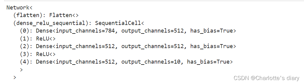 定义神经网络时,可以继承nn.Cell类,在__init__方法中进行子Cell的实例化和状态管理,在construct方法中实现Tensor操作。construct意为神经网络(计算图)构建构建完成后,实例化Network对象,并查看其结构:三个全连接层(Dense)和两个ReLU激活函数的序列模型nn.ReLU(),nn.ReLU(),我们构造一个输入数据,直接调用模型,可以获得一个十维的Te