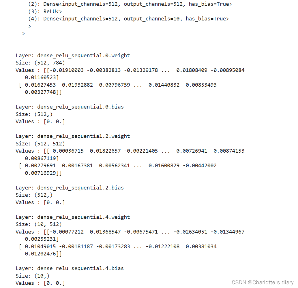 网络内部神经网络层具有权重参数和偏置参数(如nn.Dense),这些参数会在训练过程中不断进行优化,可通过 model.parameters_and_names() 来获取参数名及对应的参数详情。