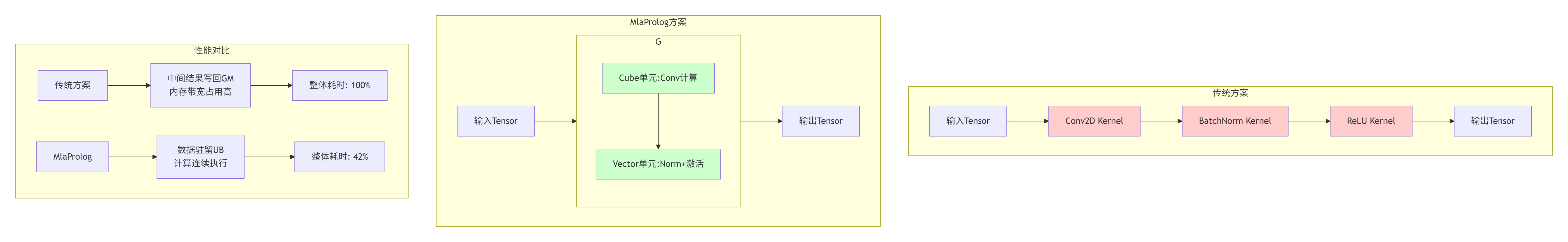 传统AI加速器算子设计往往陷入“单算子优化”的陷阱,而MlaProlog代表了一种计算流重构的新范式。其核心思想是将CV任务中频繁共现的操作序列(如卷积、归一化、激活函数)视为一个完整的计算单元,而非多个独立操作的简单拼接。