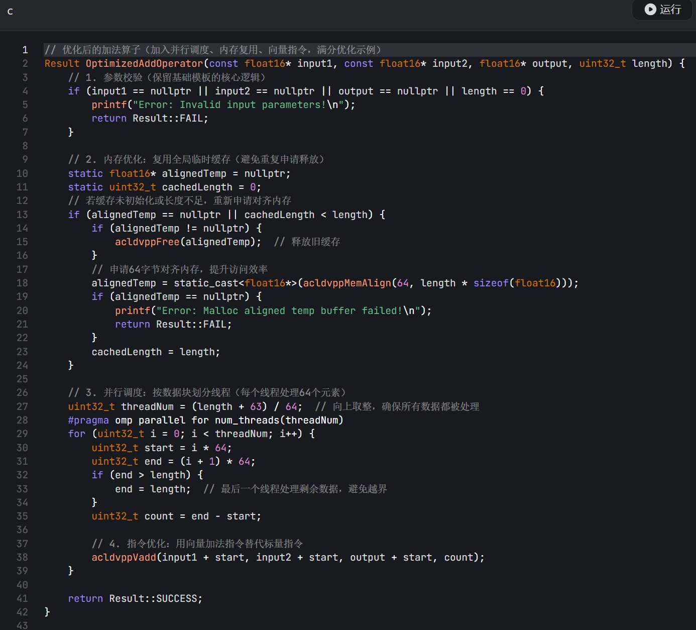 - 要求:1. 实现基础功能(维度校验、核心计算、内存管理);2. 加入至少 1 种性能优化(并行调度或内存复用);3. 代码规范(注释清晰、错误处理完善)。