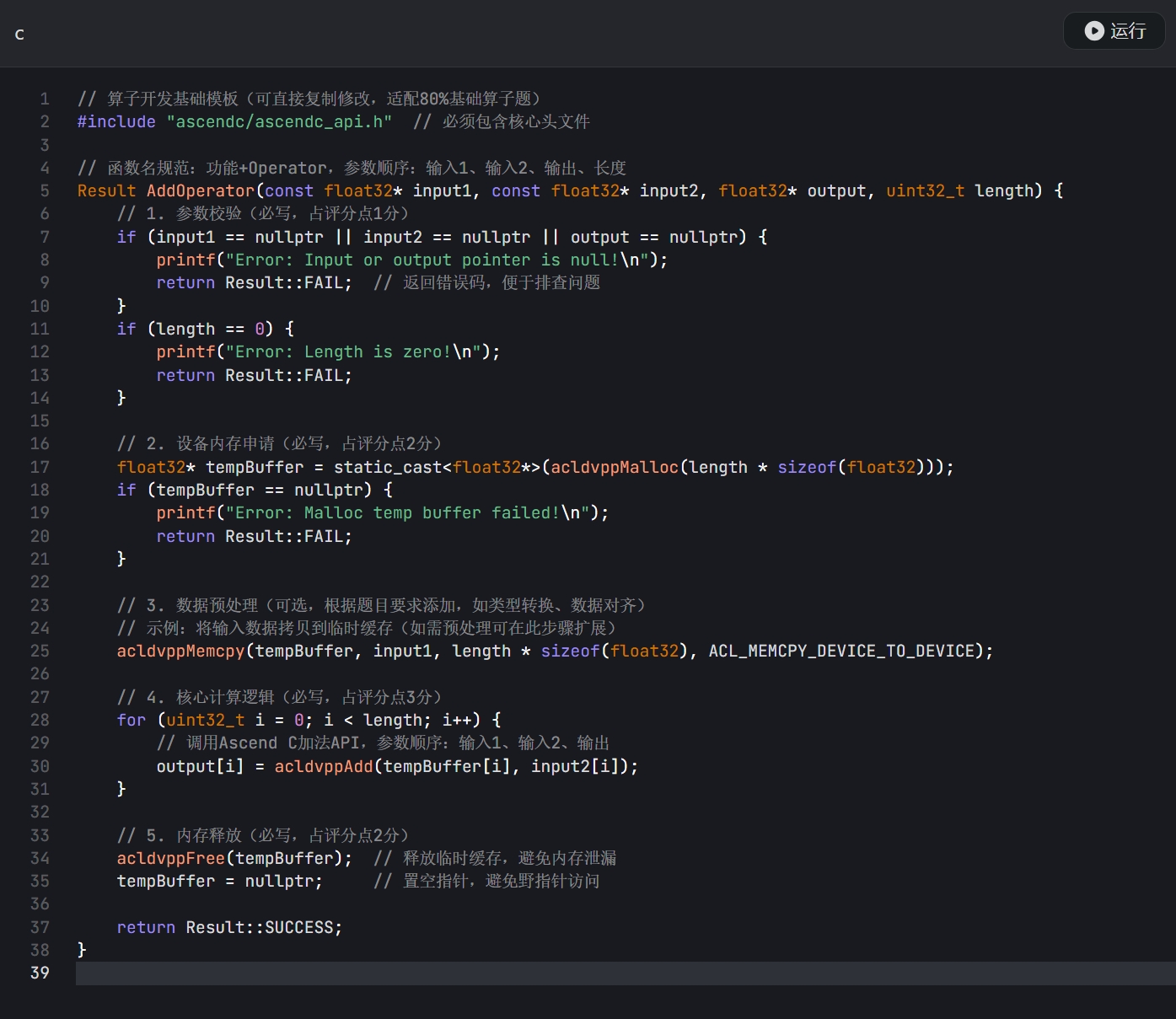 - 核心实现:按 “参数校验→内存申请→计算逻辑→内存释放” 的顺序编写代码,确保功能正常。