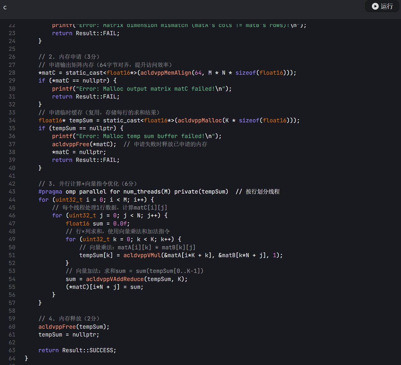 - 内存申请(3 分):申请输出矩阵 matC 的内存,同时申请 1 个临时缓存复用(存储每行的求和结果),避免在循环中重复申请内存。