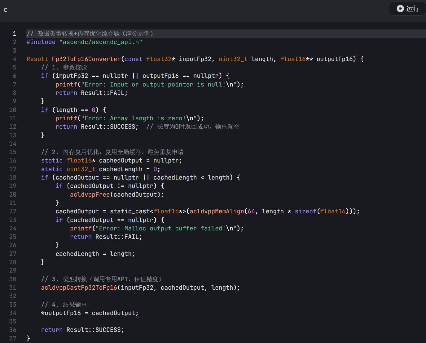 - 要求:1. 实现 FP32 到 FP16 的类型转换,保证精度损失在允许范围内;2. 加入内存复用优化;3. 处理边界情况(如数组长度为 0、输入为空)。