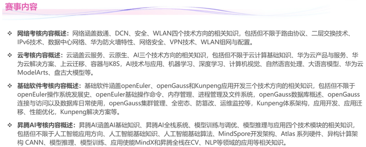 ①网络赛道:主要考察 Datacom、Security、WLAN 等 IP 领域知识,包括路由协议、二层交换技术等,相对于云、AI 等赛道,更注重基础知识和技能的掌握,题目难度对于有基础的学生来说相对较低。竞争较为激烈,不过由于其考察内容相对固定,对于基础扎实、训练有素的学生来说,仍有较大机会获奖。