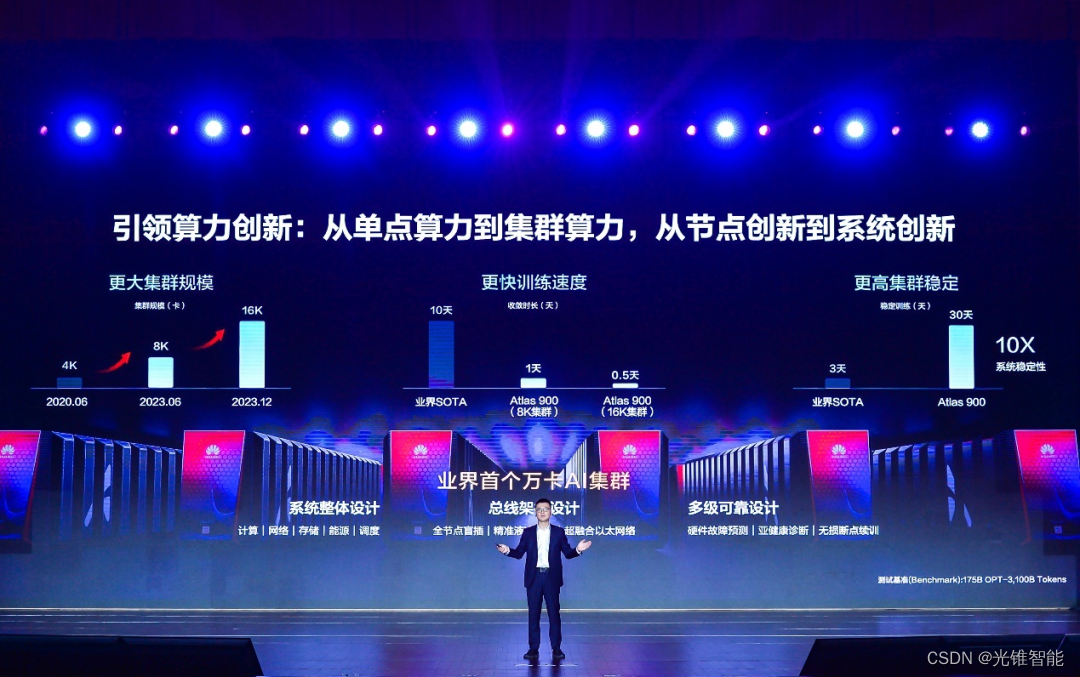 华为轮值董事长胡厚崑表示,昇腾AI的集群相当于把AI的算力中心当做一台超级计算机来进行设计,使得昇腾AI集群的性能效率达到10%以上的提升,而且系统稳定性得到十倍以上的提高。