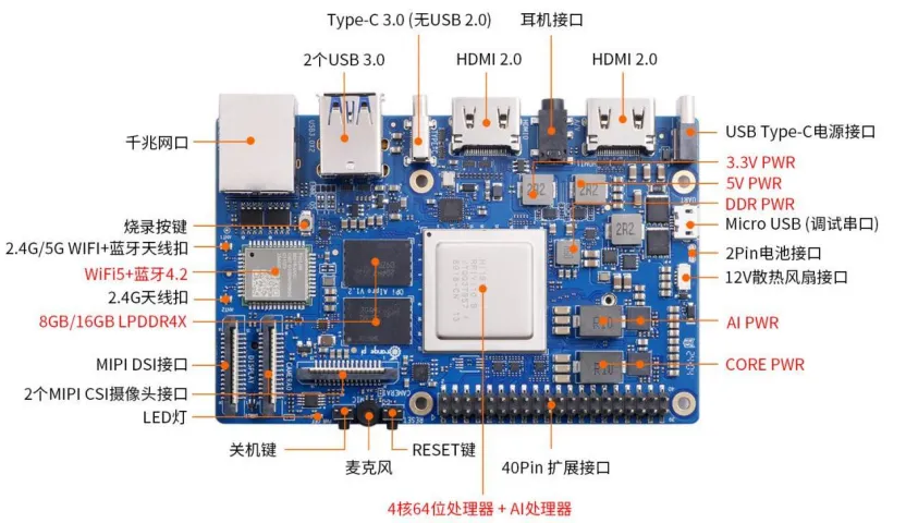 其丰富的接口更是赋予了Orange Pi AIpro强大的可拓展性。包括两个HDMI输出、GPIO接口、Type-C电源接口、支持SATA/NVMe SSD 2280的M.2插槽、TF插槽、千兆网口、两个USB3.0、一个USB Type-C 3.0、一个Micro USB、两个MIPI摄像头、一个MIPI屏等,预留电池接口。