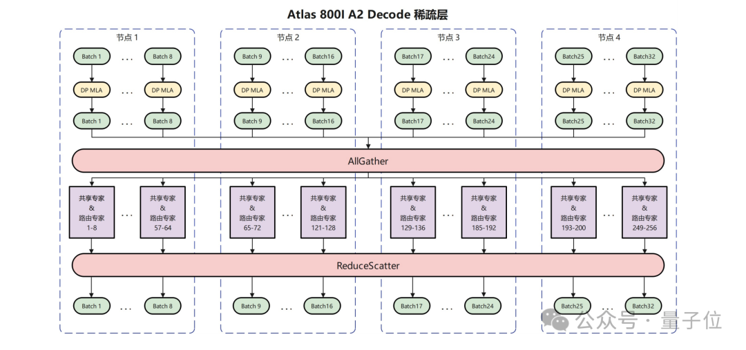 作为示例,华为团队使用2机16卡进行Prefill,4机32卡进行Decode,每卡部署8个路由专家和1个共享专家,MLA部分采用DP并行,并针对性地使用在真实负载下性能更优的AllGather/ReduceScatter的通信方案。