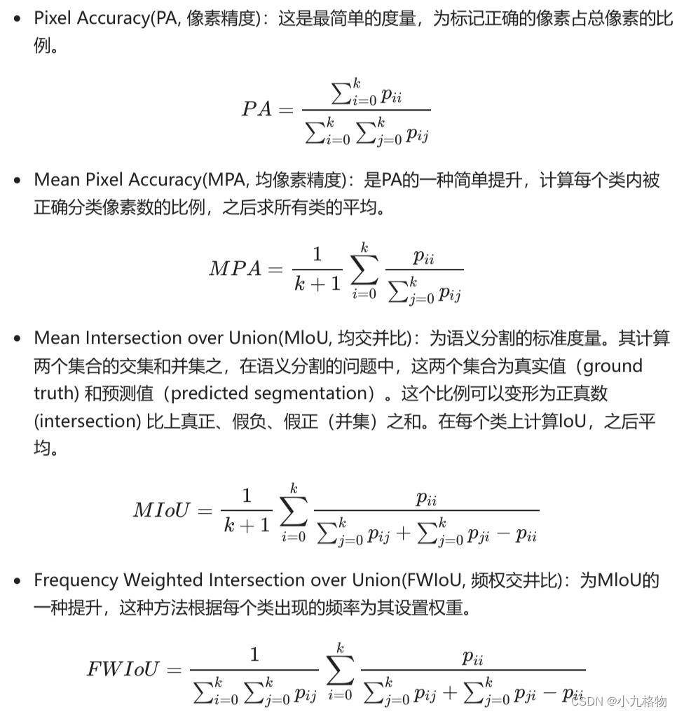 这一部分主要对训练出来的模型效果进行评估,为了便于解释,假设如下:共有 k+1𝑘+1 个类(从 L0𝐿0 到 Lk𝐿𝑘, 其中包含一个空类或背景), pij𝑝𝑖𝑗 表示本属于i𝑖类但被预测为j𝑗类的像素数量。即, pii𝑝𝑖𝑖 表示真正的数量, 而 pijpji𝑝𝑖𝑗𝑝𝑗𝑖 则分别被解释为假正和假负, 尽管两者都是假正与假负之和。