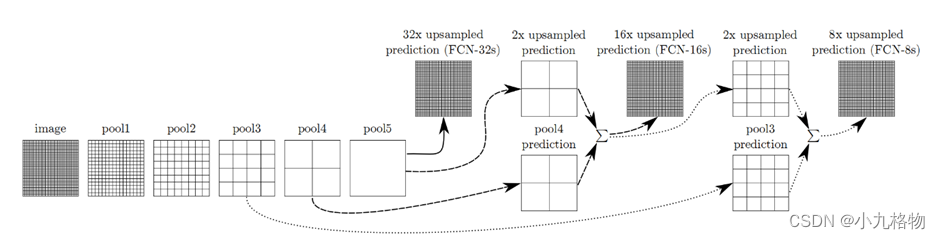 - FCN-8s是将conv7的输出进行反卷积扩大4倍,将pool4输出的特征图反卷积扩大2倍,并将pool3输出特征图拿出,三者融合后通反卷积扩大到原始尺寸。
