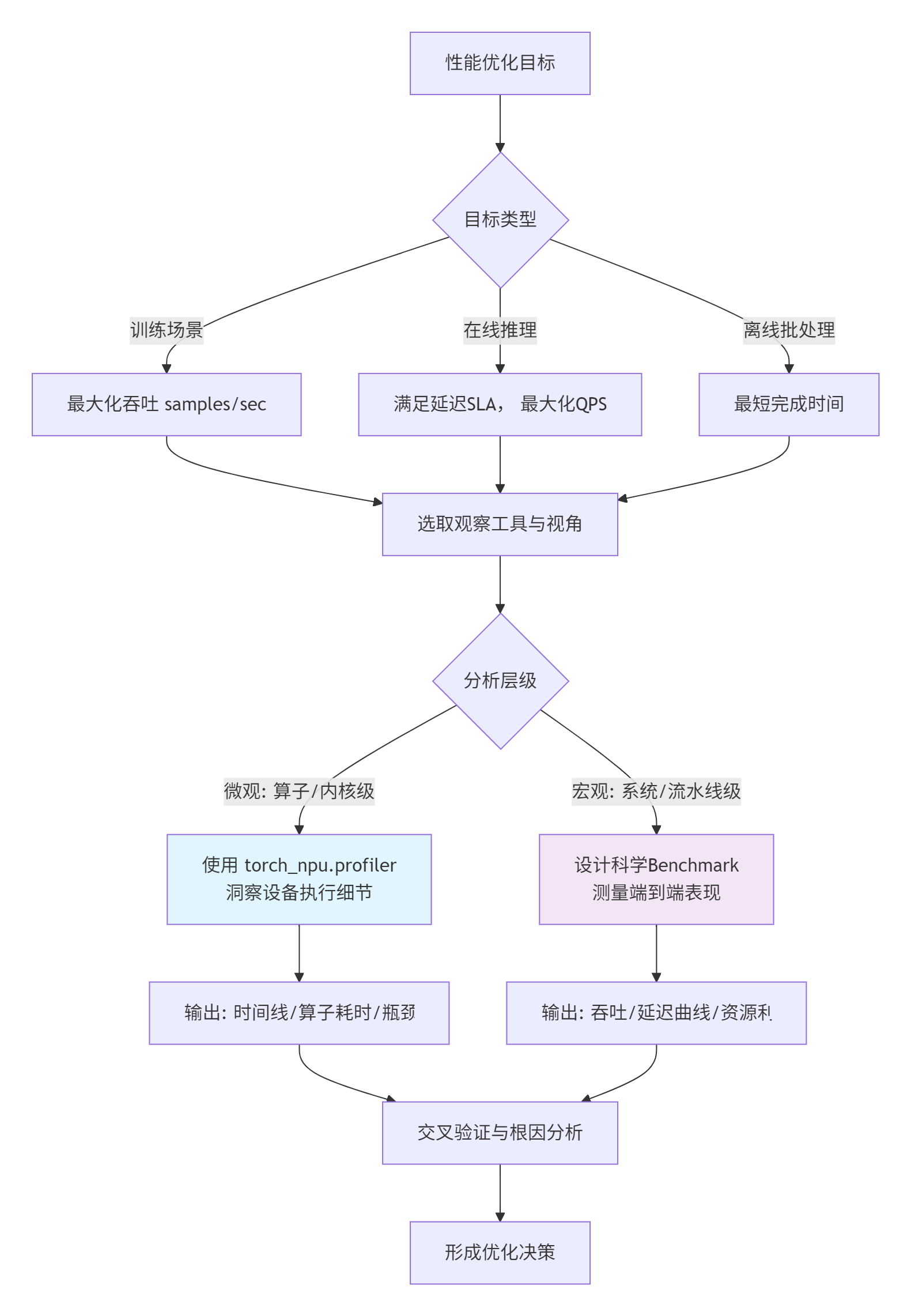 很多初级开发者盯着torch.npu.synchronize()前后掐表得到的第一个数字沾沾自喜,这离真实性能差了十万八千里。性能测试的第一性原则是:定义你的SLO(Service Level Objective)。对于训练,可能是吞吐(samples/sec);对于推理,可能是尾延迟(P99 Latency) 和吞吐。一切测试工具和方法的选取,都必须围绕这个目标展开。