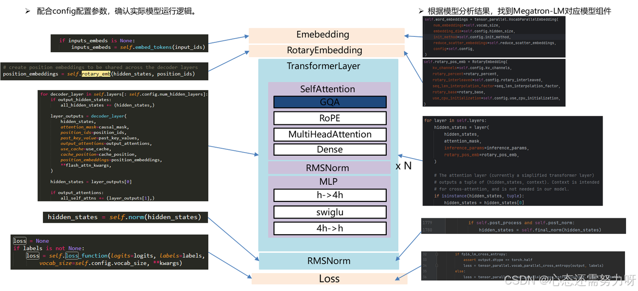 针对 CANN 架构,我们需要适配 MindSpeed LLM 和 Qwen2.5-7B 的模型结构。这里的适配主要集中在张量运算部分,尤其是 embedding、self-attention 和 MLP 层的调整。