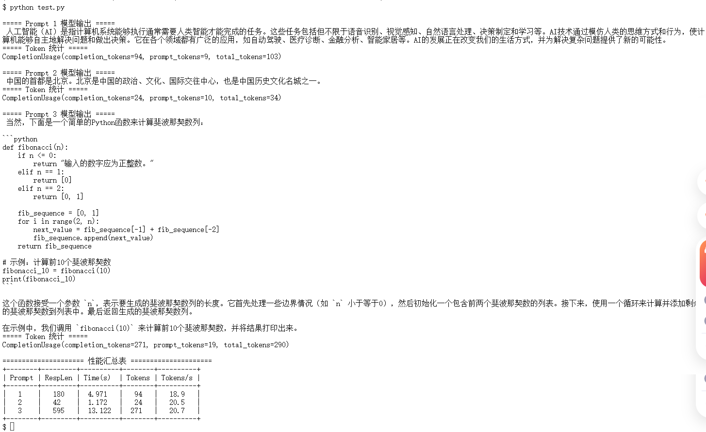 ● 测试中三个示例 Prompt 分别产生文本长度约 195、184 和 104 个字符,对应的模型输出 tokens 分别为 385、29 和 约 414,总体反映模型在不同问题下的输出量和长度差异。