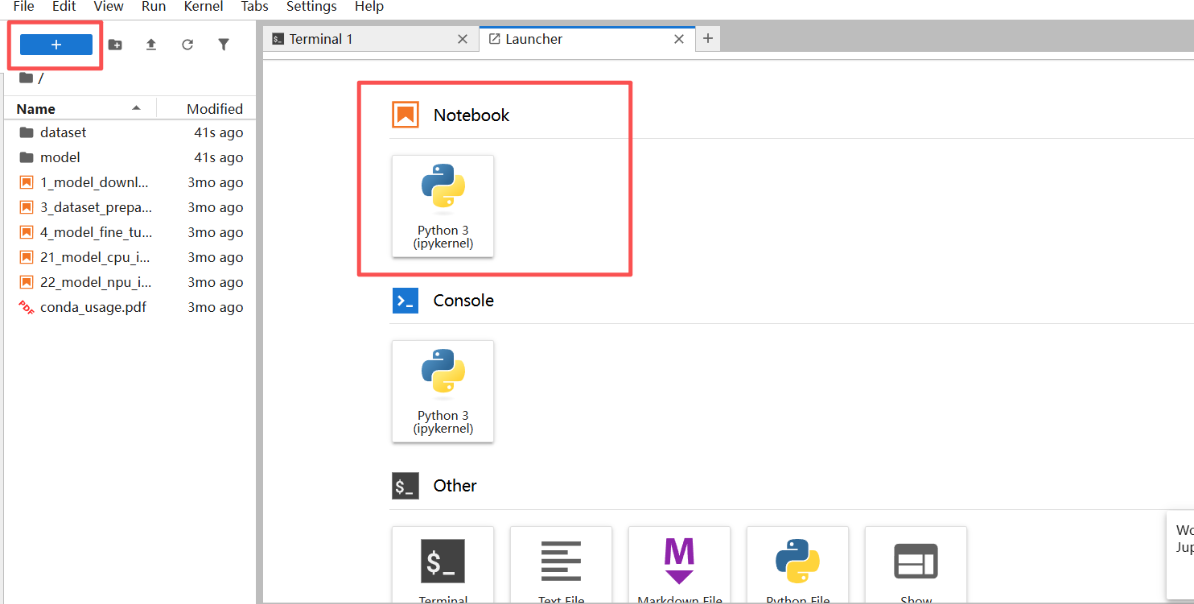 依赖安装完成后我们就可以着手下载模型了,关于模型的下载,我们只需要新建一个Notebook下面的py文件 在里面输入代码执行即可,这个过程可能需要等待几分钟时间,弹出下载完成即可
