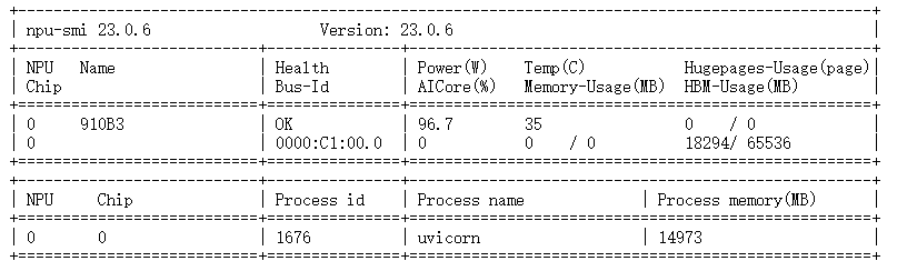 ● AICore 利用率:96.7%,说明当前推理负载很高。
