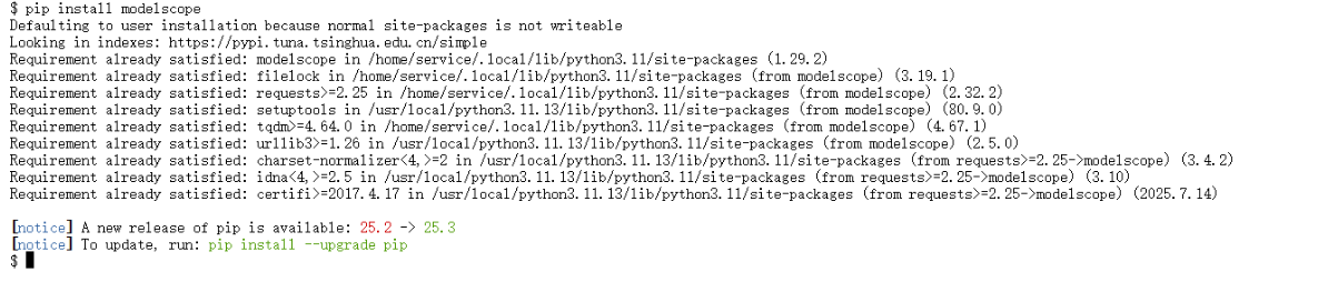 由于 HuggingFace 下载链路有时不稳定且速度较慢,本次部署改用 ModelScope(魔搭社区)提供的 Python SDK 来高速获取模型文件,从而保证了整个部署流程的顺畅与高效。安装过程非常简单,执行命令后即可快速完成。
