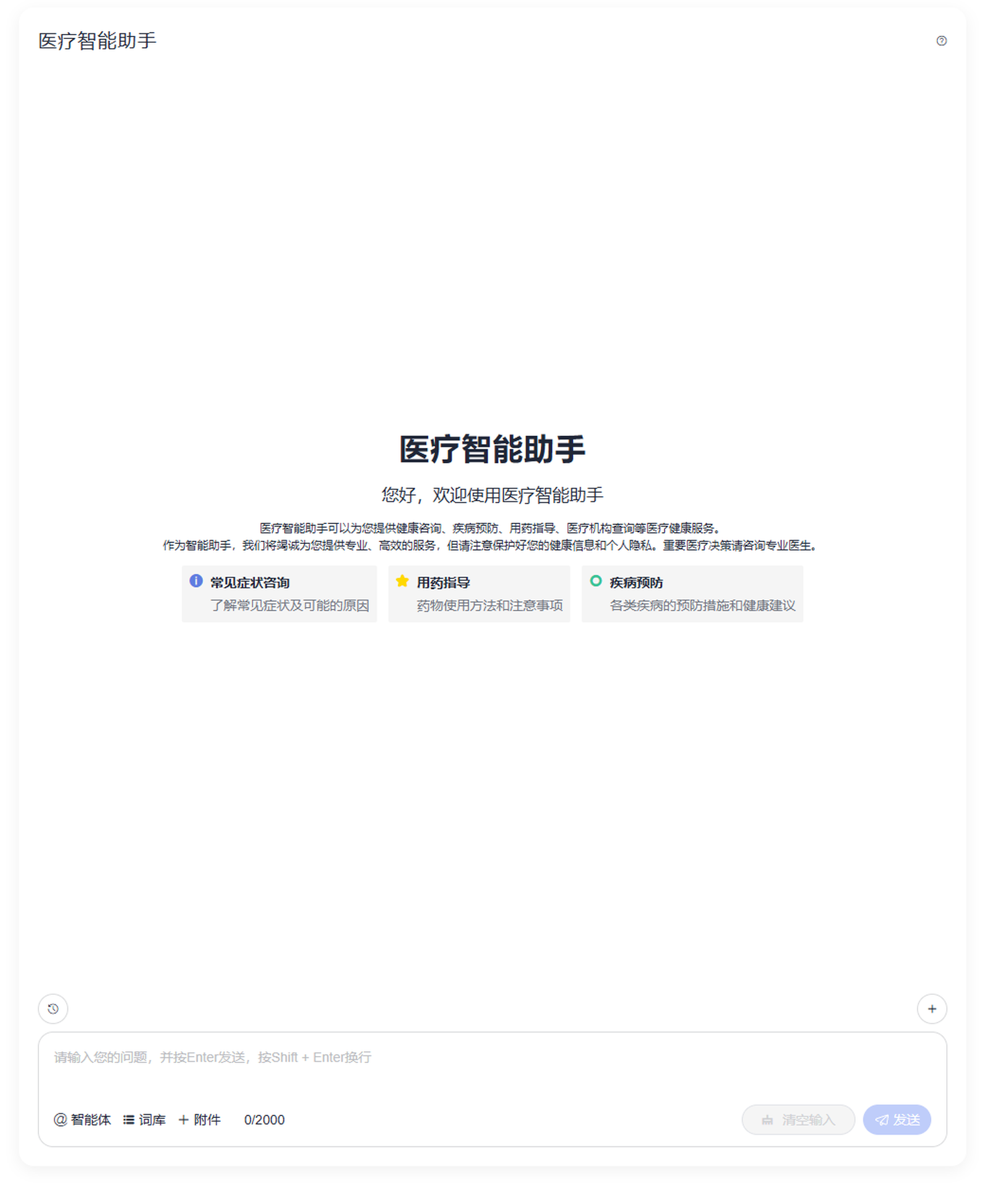 提供专业的医疗健康咨询服务,支持用户通过预设问题快速开始咨询,或输入自定义问题与智能体互动。