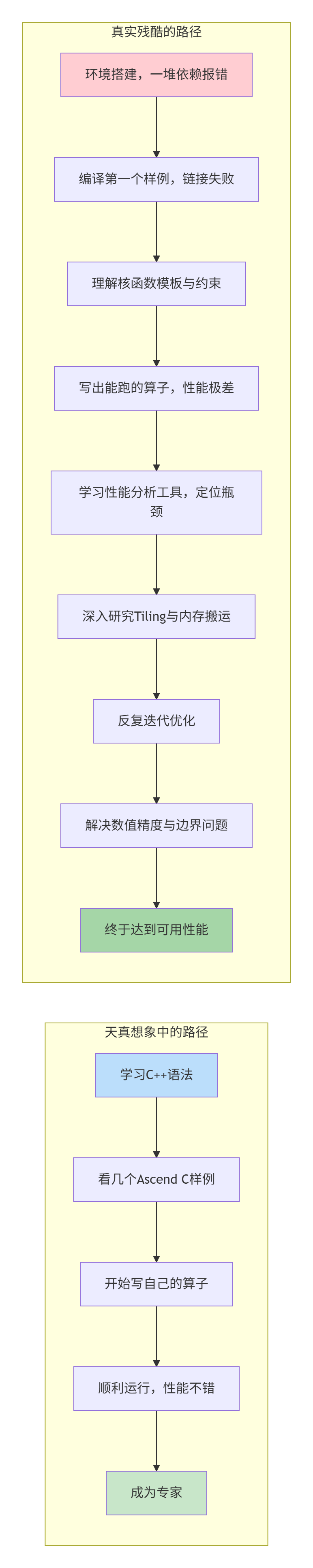 下面的Mermaid图,描绘了新手理想中与实际面临的Ascend C学习路径差异: