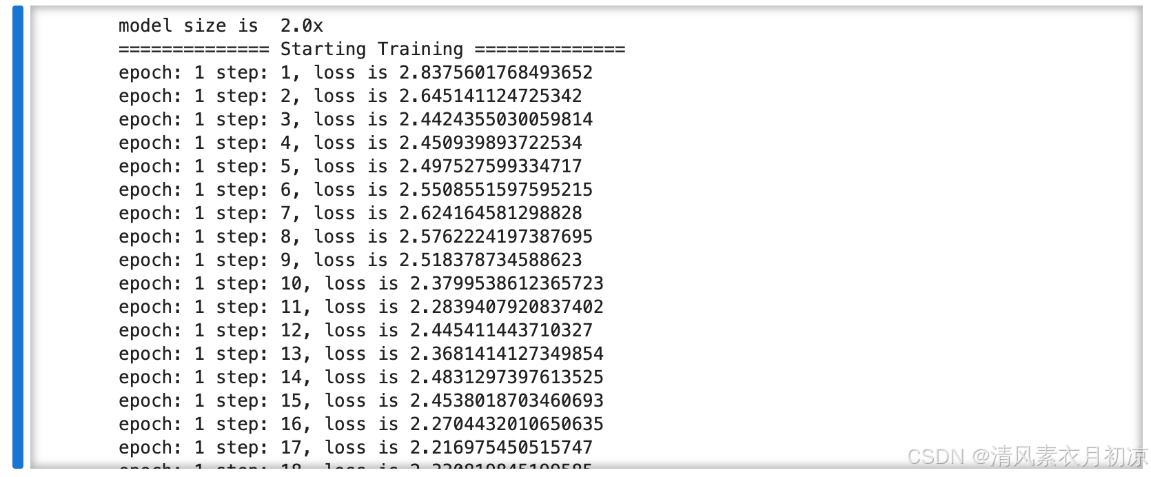 本节用随机初始化的参数做预训练。首先调用ShuffleNetV1定义网络,参数量选择"2.0x",并定义损失函数为交叉熵损失,学习率经过4轮的warmup后采用余弦退火,优化器采用Momentum。最后用train.model中的Model接口将模型、损失函数、优化器封装在model中,并用model.train()对网络进行训练。将ModelCheckpoint、CheckpointConfig、TimeMonitor和LossMonitor传入回调函数中,将会打印训练的轮数、损失和时间,并将ckpt文件保存在当前目录下。