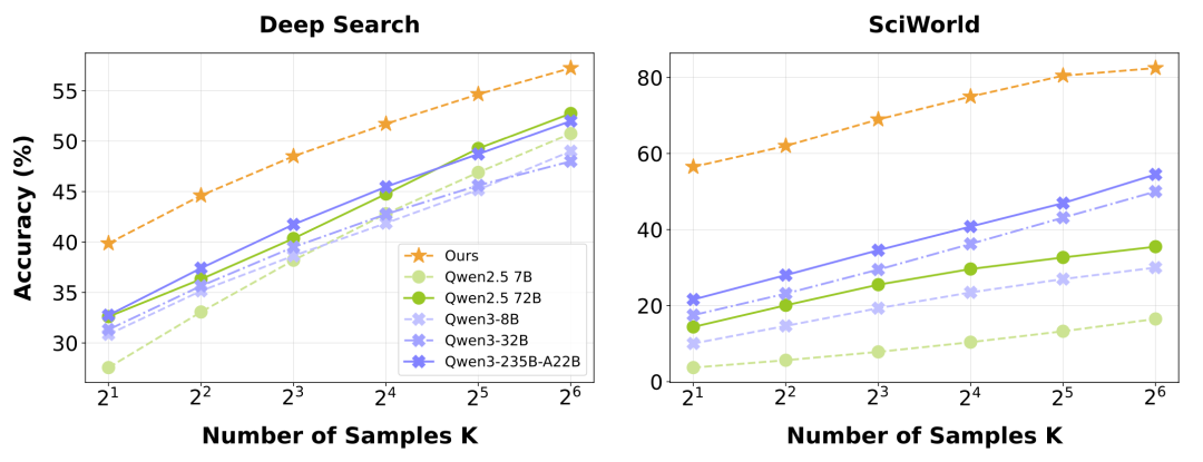 相较于传统测试时扩展方法,新路径优势显著:传统方法局限于模型内部,仅靠延长思维链消耗更多 Token,缺乏与外部环境的实时互动,难以应对复杂任务的动态场景需求;而扩展交互轮次突破了这种封闭式推理,允许模型依据每轮反馈动态修正策略,最终以更结构化的决策流程、更高效率的问题解决路径完成任务,成为智能体范式下表现更优的测试时扩展方案。