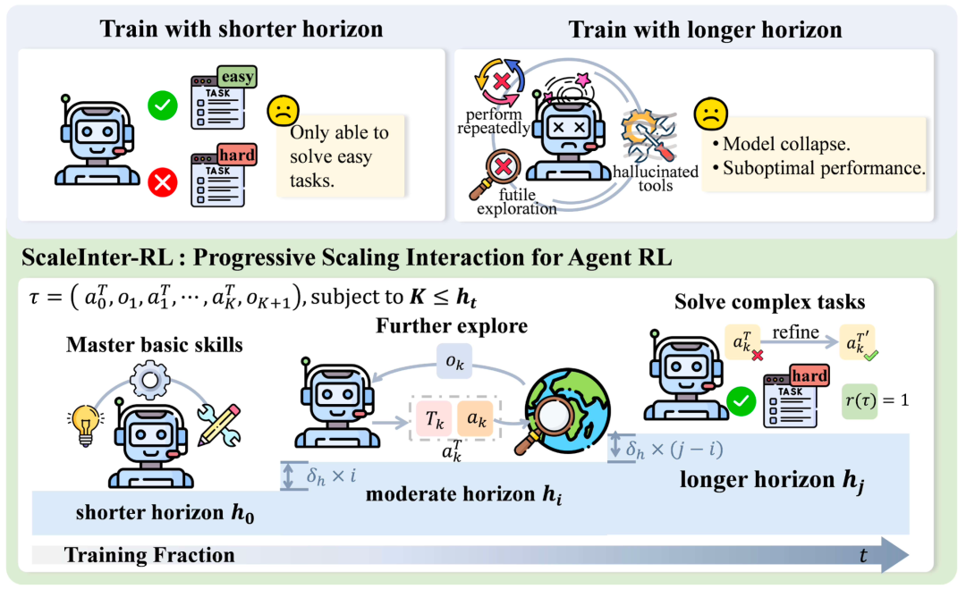 - 引入 ScalingInter-RL 方法:这是一种基于渐进式交互轮数拓展的强化学习训练方法,使智能体能够逐步适应环境,优化其交互模式、行为和技能,最终在探索和利用之间实现更好的平衡。