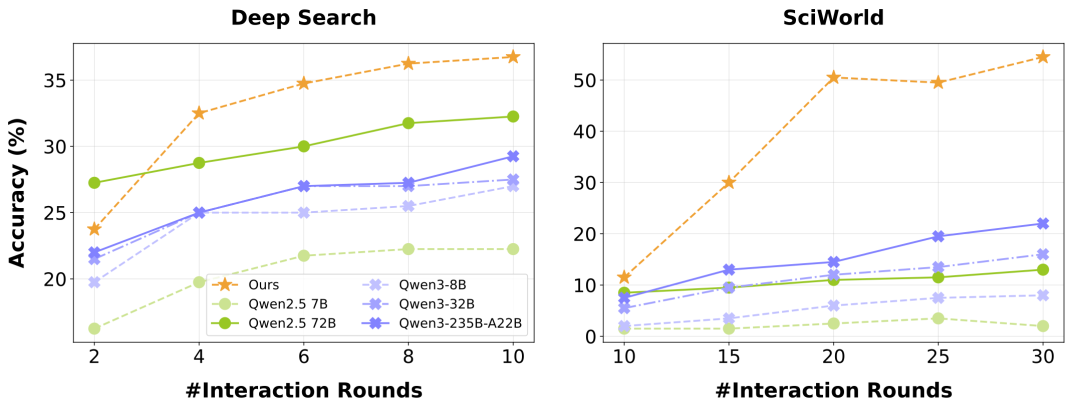 在实际应用中,这种策略展现出了显著的优势。在网页导航任务中,初始阶段,智能体通过有限的交互轮次,迅速掌握了基本的网页操作技能,如点击链接、填写表单等。随着训练的深入,交互轮次的增加使得智能体能够更加深入地探索网页的各种功能和结构,学会了根据不同的任务需求,灵活地调整操作策略,从而更加高效地完成任务。在科学任务中,智能体在初期利用有限的交互学习基本实验操作,随着交互轮次的增多,能够更全面地探索实验条件和变量之间的关系,优化实验步骤,提高实验成功率。