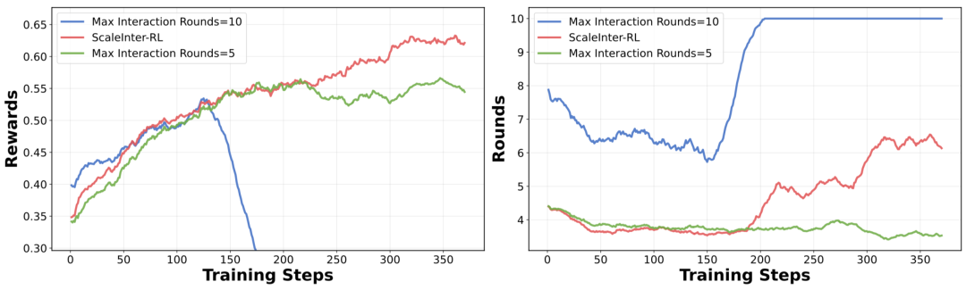 在训练的初始阶段,智能体的主要任务是快速学习基本技能,解决相对简单的问题。此时,ScalingInter-RL 会限制交互轮次,引导智能体集中精力利用已有的知识和策略,尽可能高效地完成任务。这种策略就像是为智能体制定了一个循序渐进的学习计划,让它在稳固的基础上逐步成长。