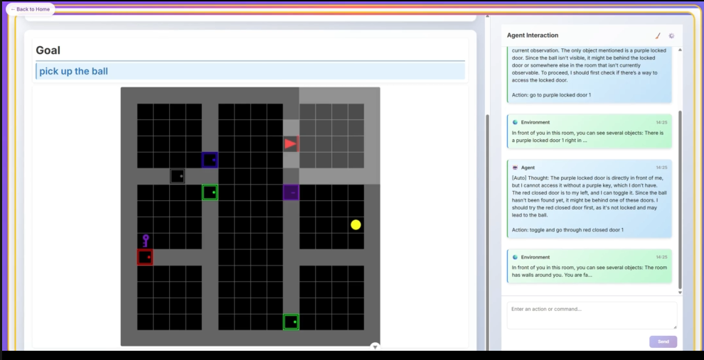 而基于 AgentGym-RL 框架、经 ScalingInter 算法训练的智能体,正是在这类高难度场景中展现出了令人瞩目的表现。它不仅能精准理解任务核心目标,还能在多扇彩色门与未知房间构成的复杂环境中,开展有条理的探索活动,合理规划行动顺序;当确认某一区域无探索价值后,更能主动离开并转向新的探索路径。尤为难得的是,它能高效利用已获取的环境信息,将分散在不同时间节点的观察结果串联起来,构建连贯的决策链路。正是这种跨步骤的信息整合能力与动态调整机制,让它在复杂环境中始终保持清晰且高效的任务执行能力。