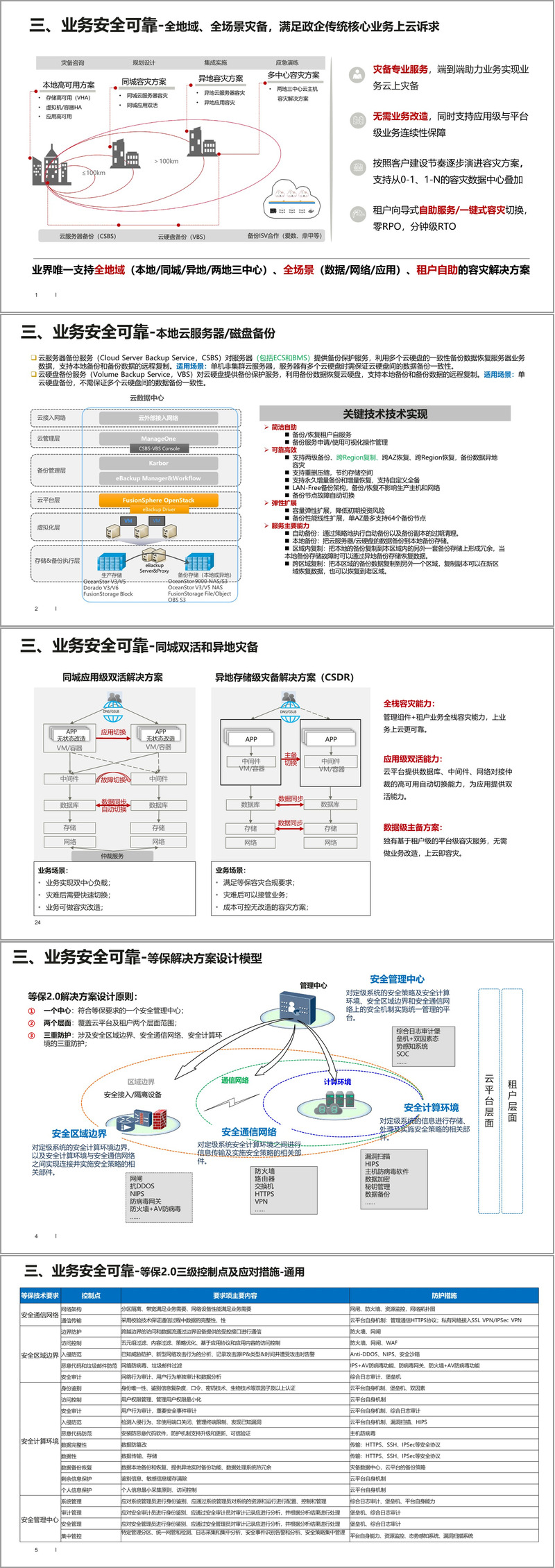 安全与可靠性是政企上云的核心关切。云Stack提供从等保2.0合规设计到全地域、全场景的灾备方案,包括同城双活、异地容灾、两地三中心等多种模式,并实现租户自助式的容灾切换与演练。在安全架构上,方案覆盖网络、计算、数据、管理四大层面,形成纵深防御体系,满足金融、政务等行业对数据主权与业务连续性的高标准要求。